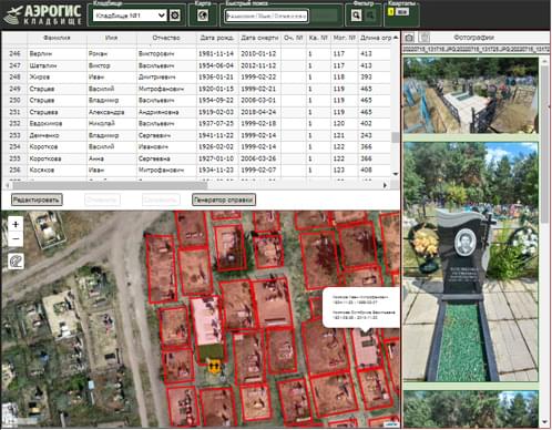 Галерея изображений ПО «АэроГИС Кладбище» в режиме просмотра отображает фотографии захоронений, выбранных в таблице или на карте. В режиме редактирования позволяет привязывать/отвязывать фотографии и их GPS-координаты к строчкам в таблице.